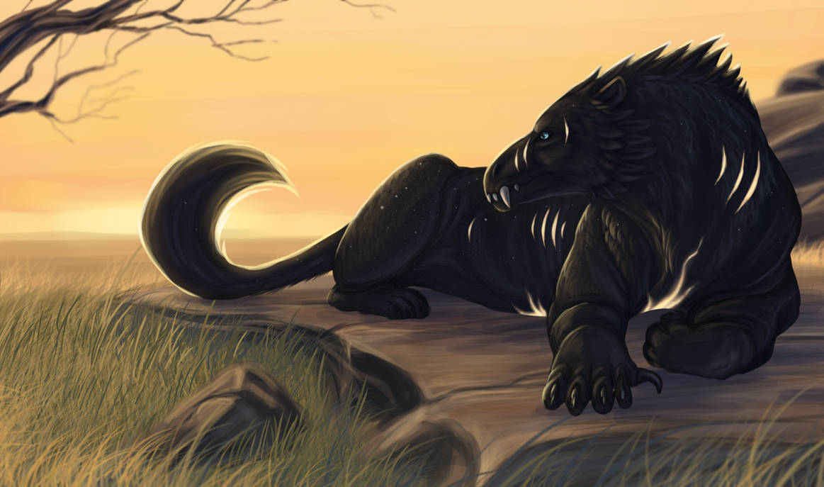 Depict your ketucari peacefully enjoying the scenery of the Bayan Plateau. They can be napping, observing the environment, interacting (non-lethally!) with the native fauna, or whatever else you can think of!