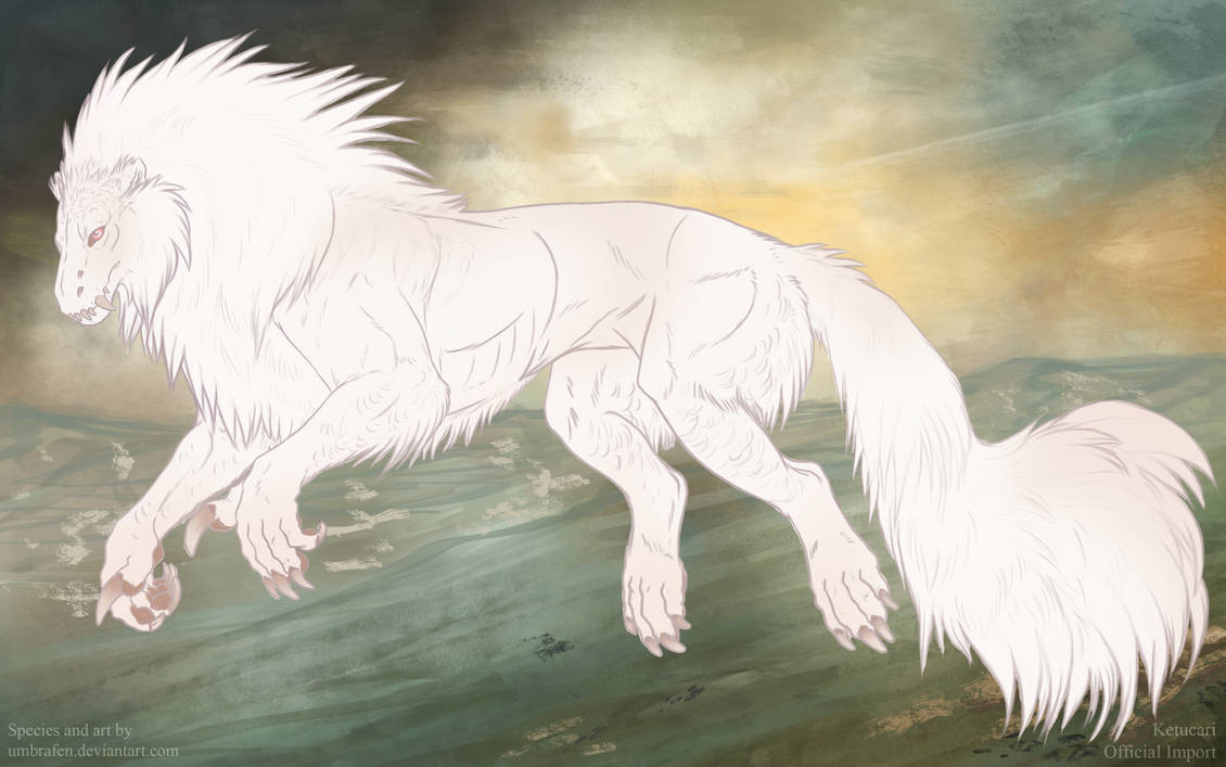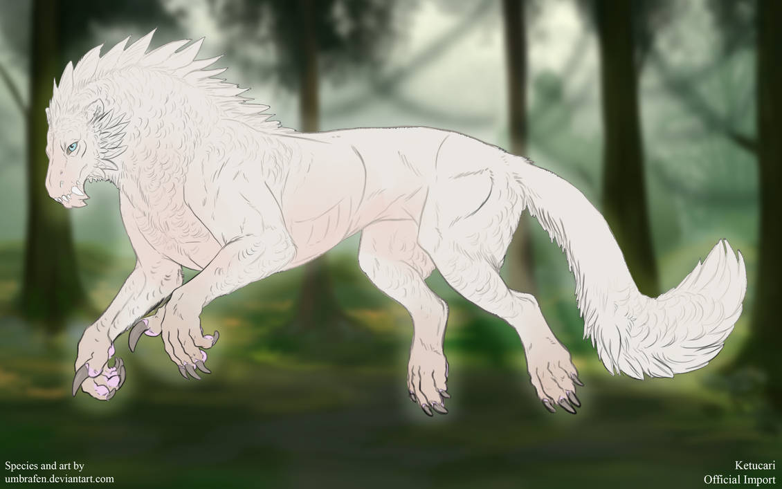 Albino ketucari are completely white. No markings will show*. You may include subtle pink coloration to denote flesh, but it must not be too vibrant. Skin should be pink, and the eyes can be light blue, red, or pink.