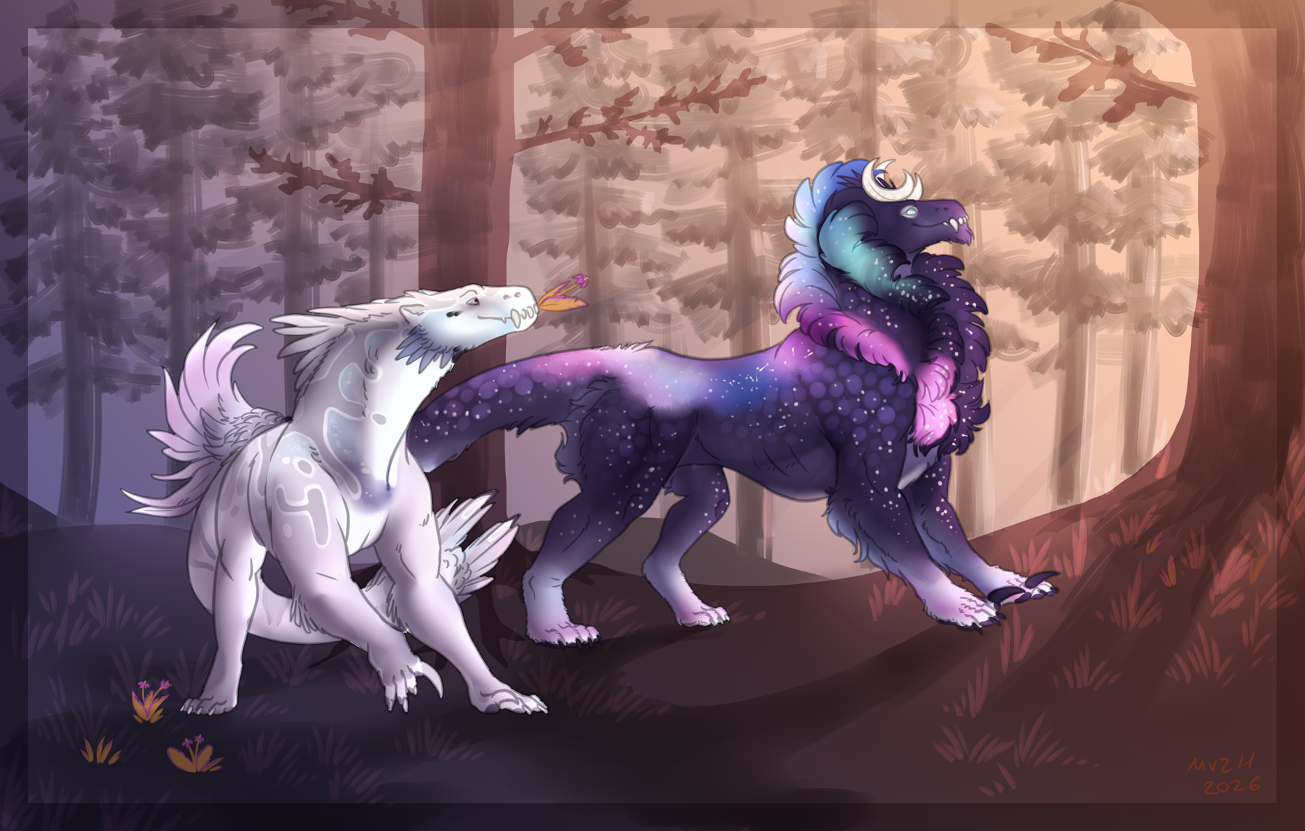 Galaeth enjoys the attention of a fellow traveler, while Ghost enjoys someone receptive to his attempts to connect..